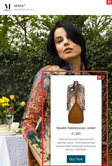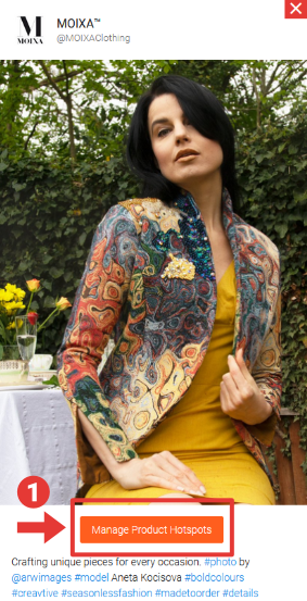 Product Hotspots are shoppable Hotspots icons that can be placed directly on images within UGC that feature your product, like swing tags or swing-tickets on garments. When the UGC is shown in Widget Displays, hovering the mouse over the Hotspot or clicking on it reveals details of the product, including a link that leads visitors directly to your store to purchase or learn more about the product or service.