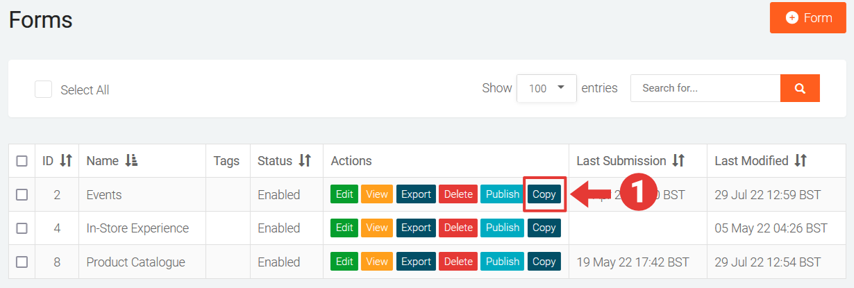 - On the Forms page, click the corresponding Copy button under the Actions column for the Form you wish to duplicate.