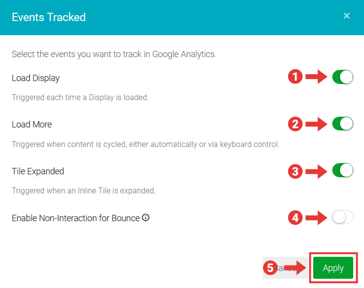 - Enable Non-Interaction for Bounce - when disabled and any of the above Events are triggered, Google Analytics will not record the Display URL as a bounce and unnecessarily show higher bounce-rates. Learn more. We recommend leaving this disabled for Event Displays.