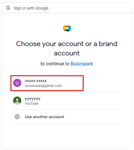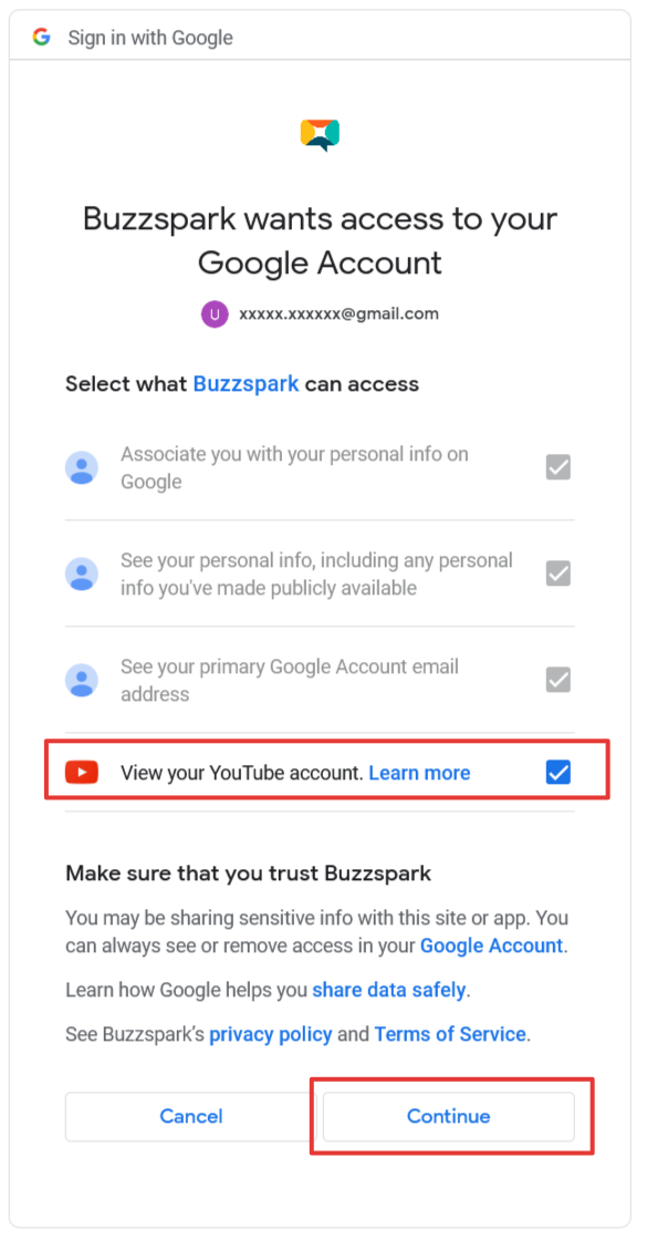 Ensure that the View your YouTube account permission is selected and click on the _Continue _button to authorise Buzzspark to access your account. Buzzspark will never publish content on your behalf and at no point will your account information be exposed or used by Buzzspark for anything other than aggregating content.