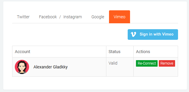 You can connect additional Vimeo accounts, Re-Connect or _Remove _existing accounts at any time from the Connections page.
