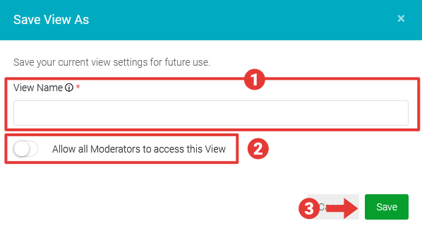 - In the Save View As modal, edit the view name and access for all Moderators if required and click Save to save the view.