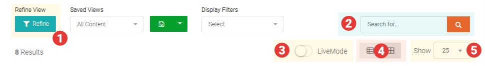 - Select the number of Tiles that are shown in the Content section via the Show drop down (not applicable in Live Mode).