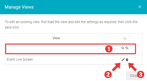 - Click on the Delete icon for an existing View to Delete it and click on the Close button to exit the Manage Views modal when done.