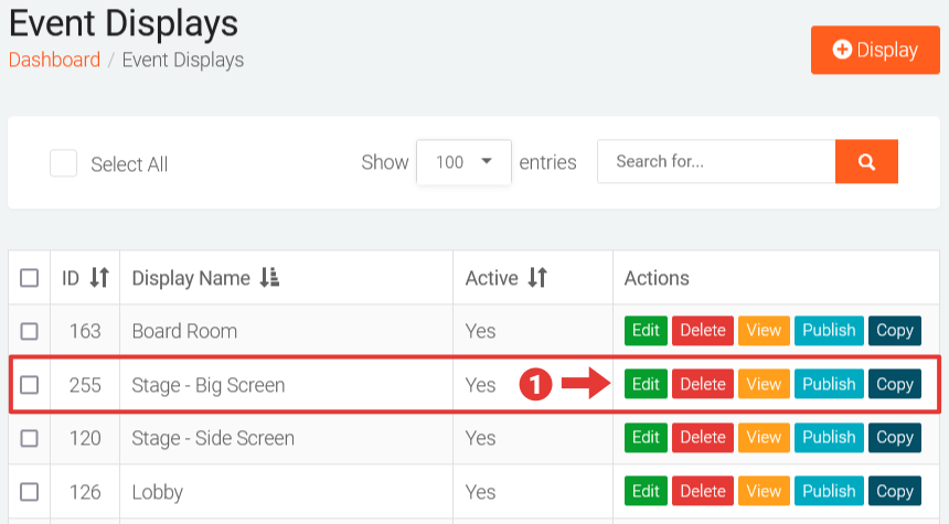 - On the Event Displays page, click on the Edit button under the Actions column for the Event Display you wish to edit.