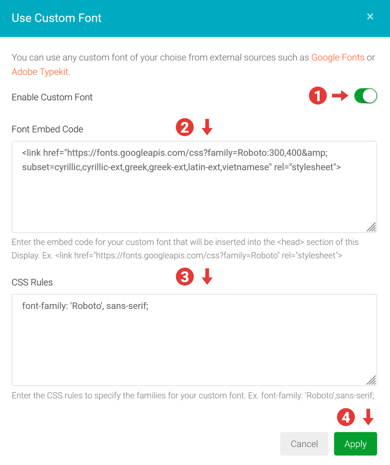 Use Custom Font – click on the Use Custom Font button to enter details of any custom fonts you wish to use in this Display.