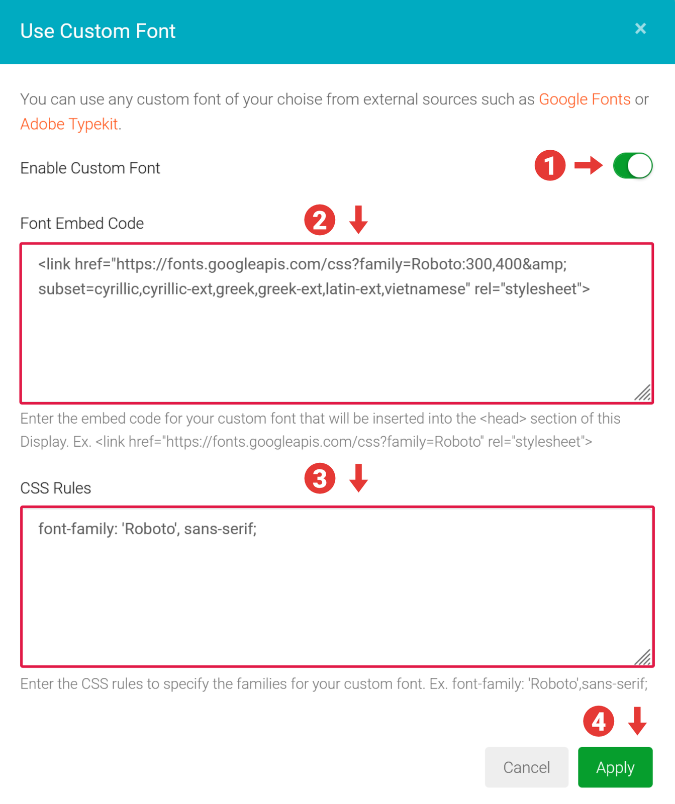 - CSS Rules – paste CSS rules for your custom font