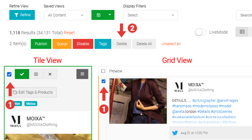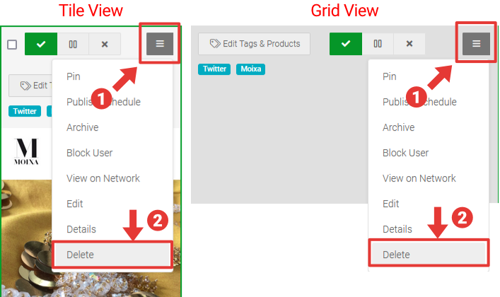 - Select the checkbox for the Tiles you wish to delete. The checkbox is located at the top left in Tile View (left image) and in the left-column in Grid View (right image)