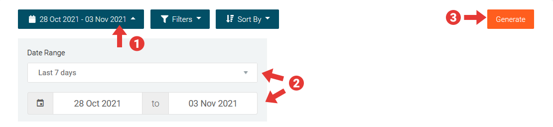 - Select the required period in the Date Range dropdown by either selecting a pre-defined period from the_ Date Range_ dropdown, or entering custom dates in the From and _To _ fields.