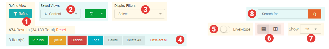 The Bulk Actions toolbar allows you to perform actions on multiple Tiles (pieces of Content) in one go. For example, you may wish to Publish or add Tags to multiple Tiles in one go. This toolbar is hidden by default, appearing only when one or more Tiles are selected in the Content section of the interface. See Bulk Actions in Moderation View for further details.