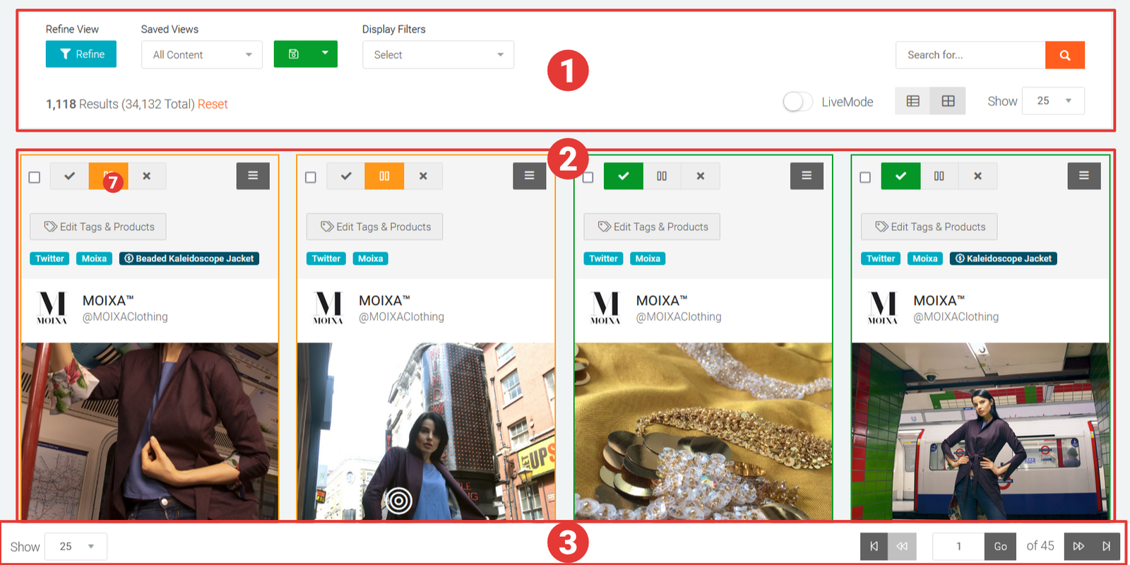 The Live Mode toggle switches between Live and Manual modes. Live mode is particularly useful for quickly moderating fast flowing content for example, where content is shown on large screen displays at live events. See Live Moderation for further details. In Manual mode, moderators can page through content using the Pagination bar at the bottom of the interface. Newly aggregated content only appears when jumping back to the first page or when the moderation view is refreshed.