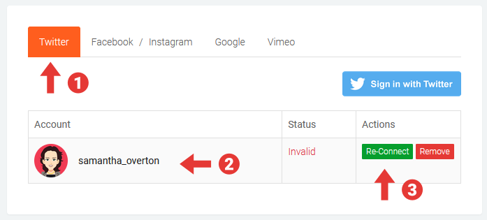 In the resulting list, locate the Twitter account you wish to re-authorise – it will appear in the list with an Invalid status.