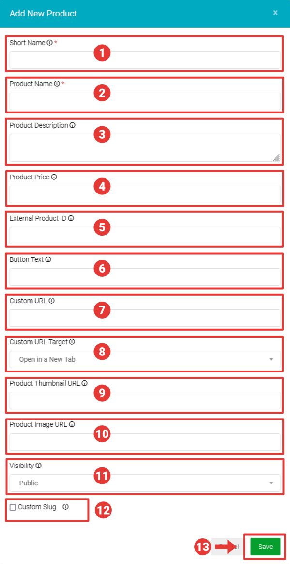 - Custom Slug – developer option that denotes a unique identifier for the Product used in CSS classes in embedded widgets. Leave blank to use the system default or enter a preferred unique name without any spaces.