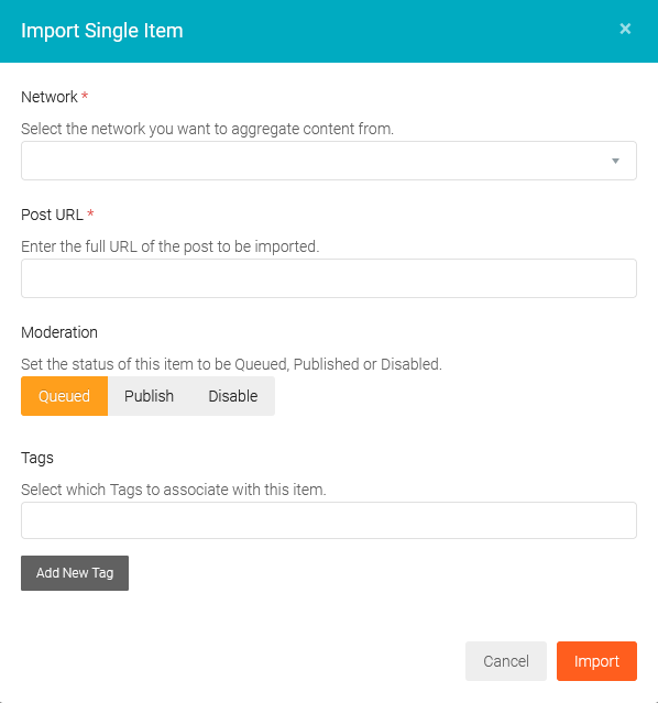 - Moderation – select the moderation status of the imported post to either Queued, Published or Disabled. As you will most likely know the item you are importing, you can save time from having to moderate it later by selecting the Publish button, so the tweet is automatically set to Published once it is imported.