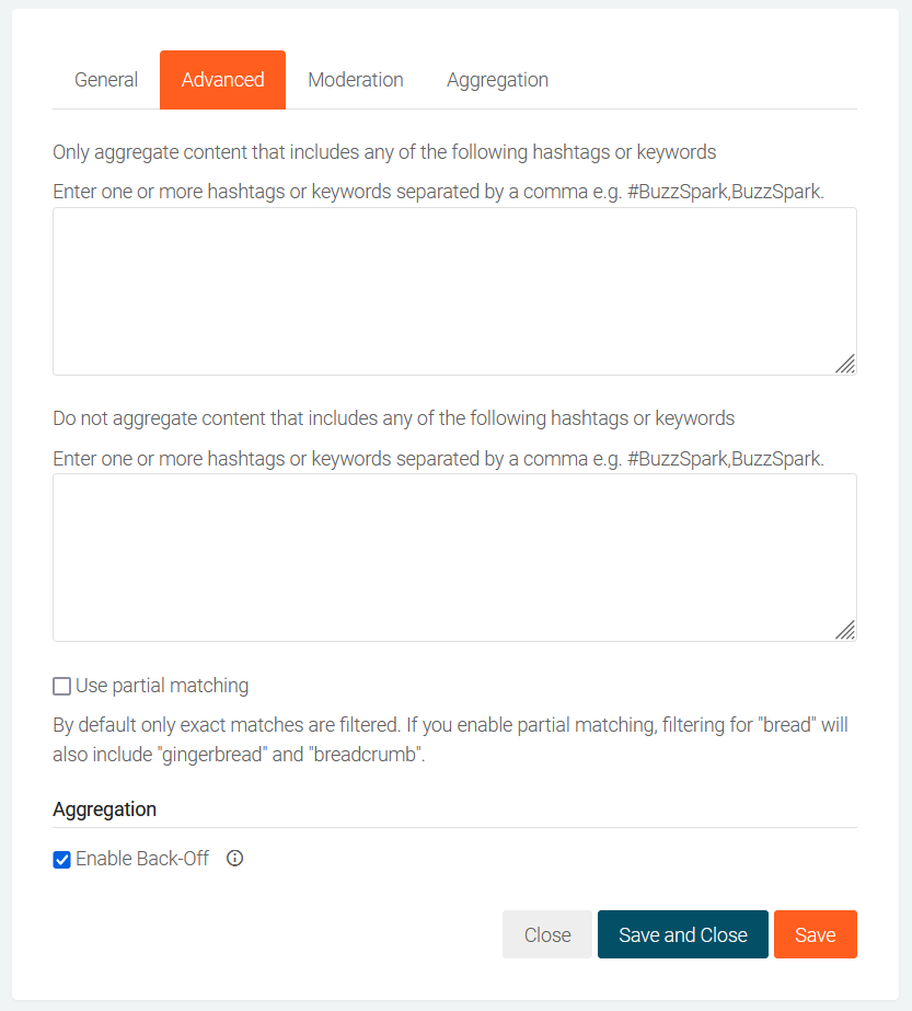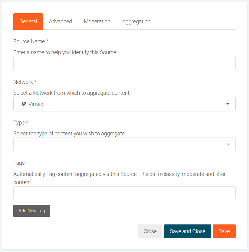 At this point you could click on the Save and Close button to save the new Source and start aggregating content, however we recommend you explore the additional steps below that guide you through advanced features for refining and filtering content that is aggregated, auto moderation, aggregating historical content and scheduling.