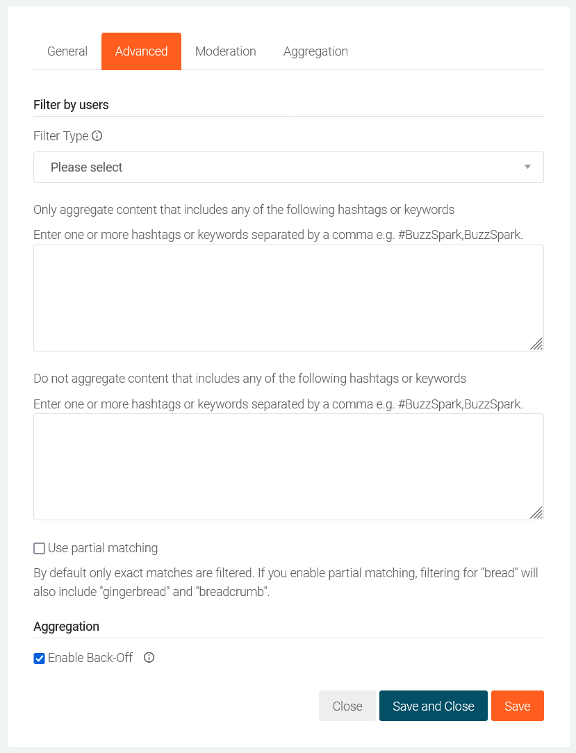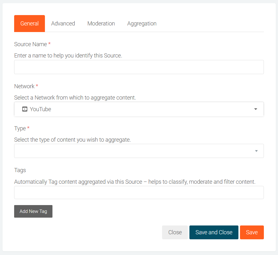 At this point you could click on the Save and Close button to save the new Source and start aggregating content, however we recommend you explore the additional steps below that guide you through advanced features for refining and filtering content that is aggregated, auto moderation, aggregating historical content and scheduling.