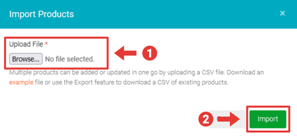- Click the Browse button to select the CSV file of Products you wish to import. New Products defined in the uploaded CSV file will be added, and existing Products referenced in the file will be updated. You can download an example CSV file, however if you have existing Products, we recommend exporting first, editing the exported file as needed and importing the edited file. See below for details on the structure and format of the CSV file.