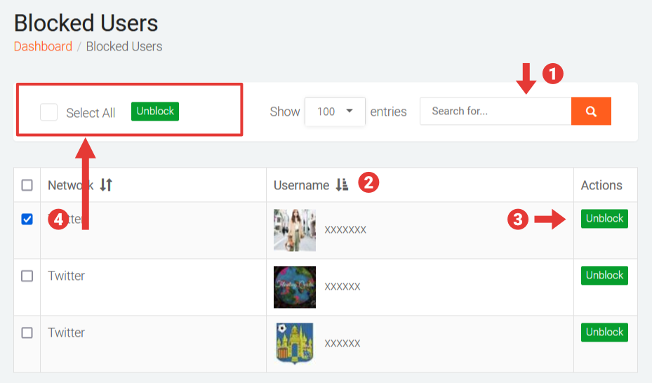 - To unblock multiple users in one go, select the corresponding checkboxes for each user and click the Unblock button in the Bulk Actions toolbar at the top.