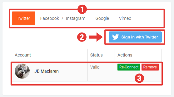 - To manage existing connections, click one of the corresponding buttons in the Actions column: Re-Connect Re-authenticates the existing connection that has become Invalid. See re-authorising or re-connecting a social connection.