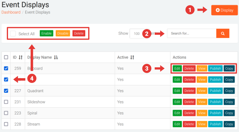 - You can perform Bulk Actions on multiple Event Displays in one go by selecting the corresponding checkboxes (or clicking the select all checkbox in the Bulk Actions Toolbar at the top) and then clicking on one of the following buttons in the Bulk Actions Toolbar to: