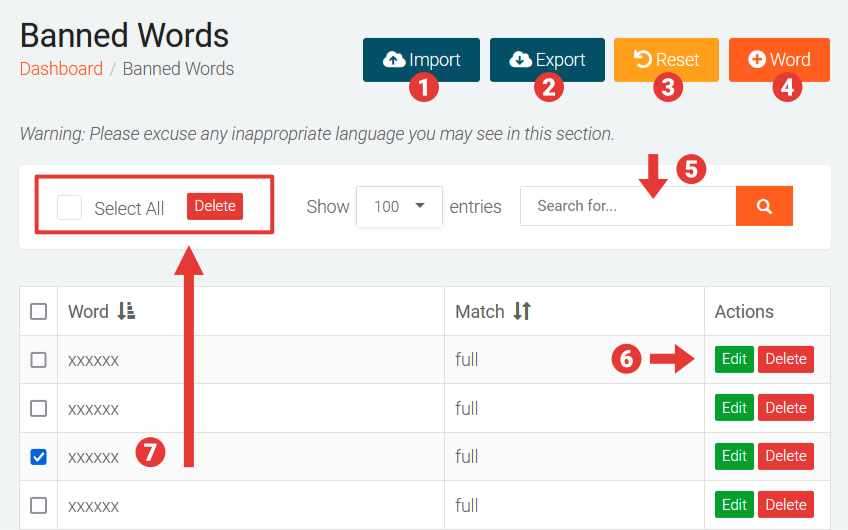 - Import – upload a list of words in a CSV file to either add to or replace the existing list of words. See Importing Banned Words.