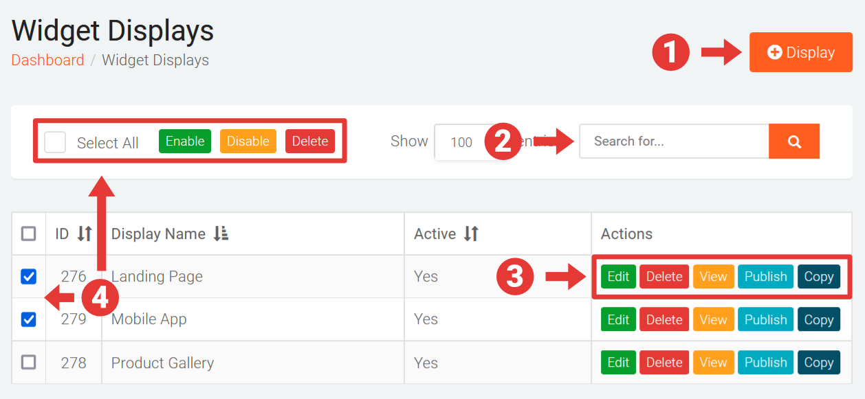 - You can perform Bulk Actions on multiple Widget Displays in one go by selecting the corresponding checkboxes (or clicking the select all checkbox in the Bulk Actions Toolbar at the top) and then clicking on one of the following buttons in the Bulk Actions Toolbar to: