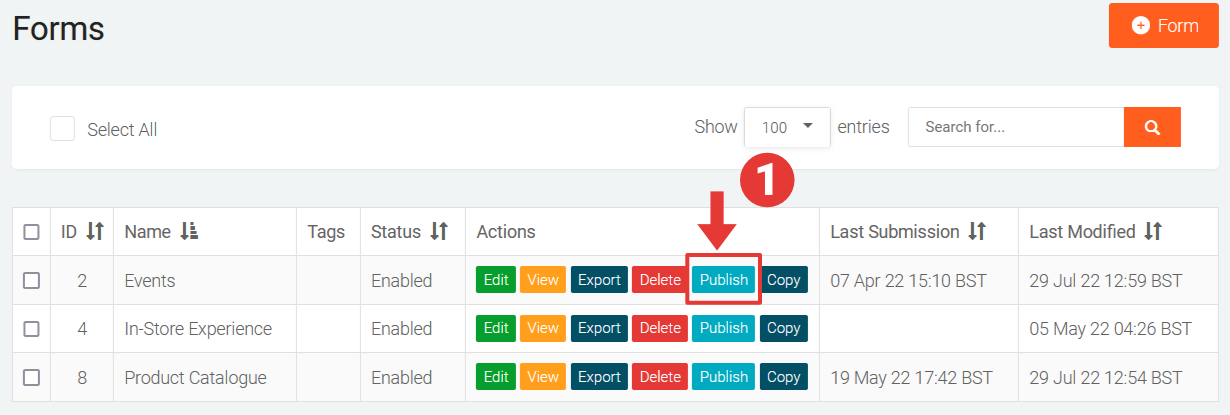 - On the Forms page, click on the Publish button under the Actions column for the Form you wish to publish. This launches the Publish Settings Modal.