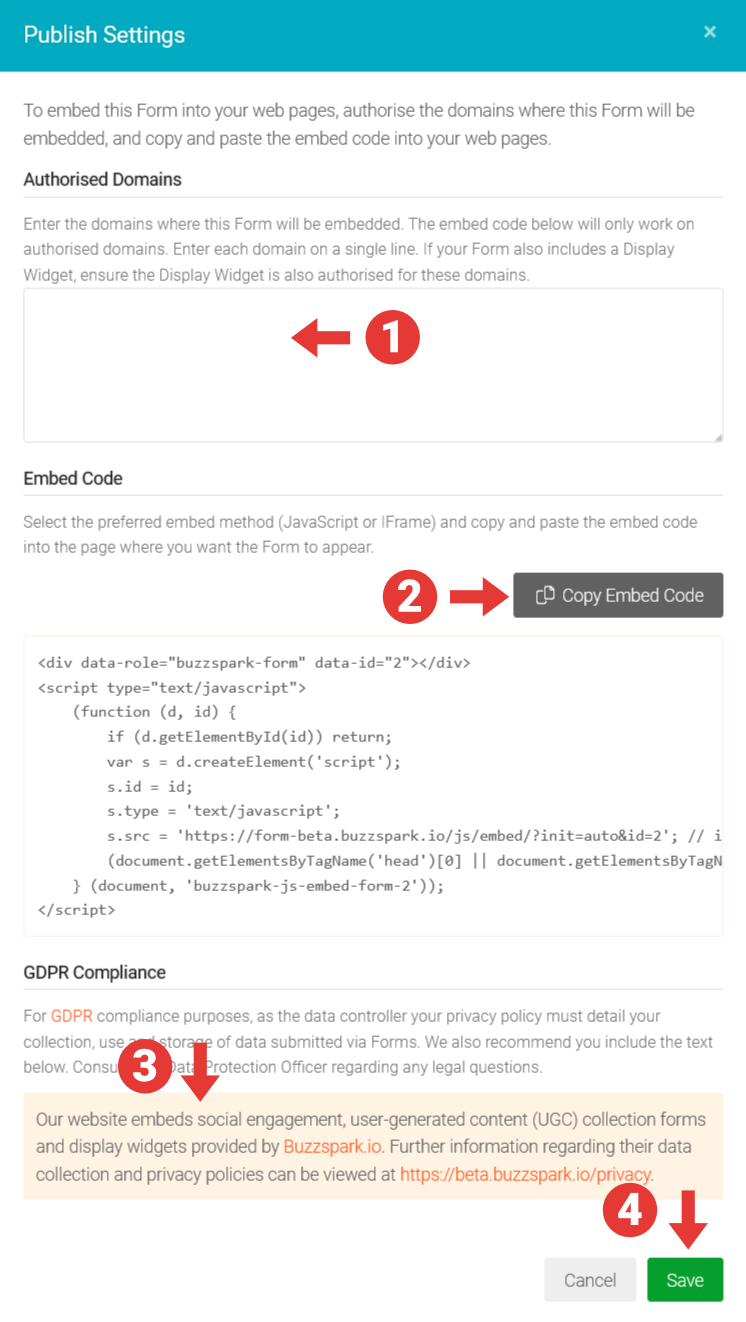 Authorised Domains – enter each of the domain names (one per line) where the Form will be embedded, for example: