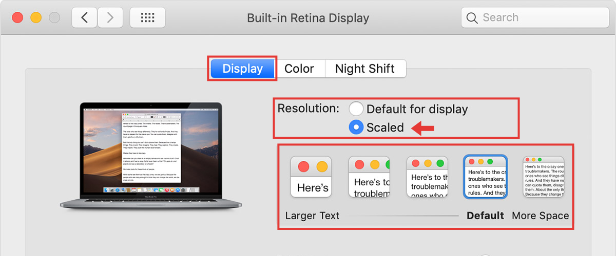 On macOS, navigate to System Preferences > Display , then set Resolution to Scaled and select any of the four or five scaled resolutions, depending on your Mac model. See https://support.apple.com/en-us/HT202471.