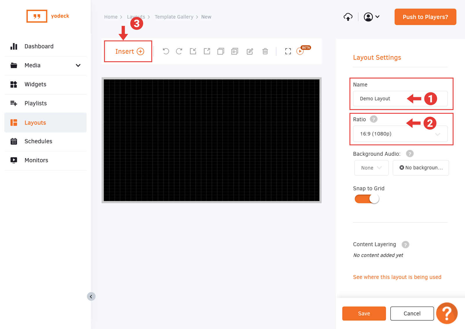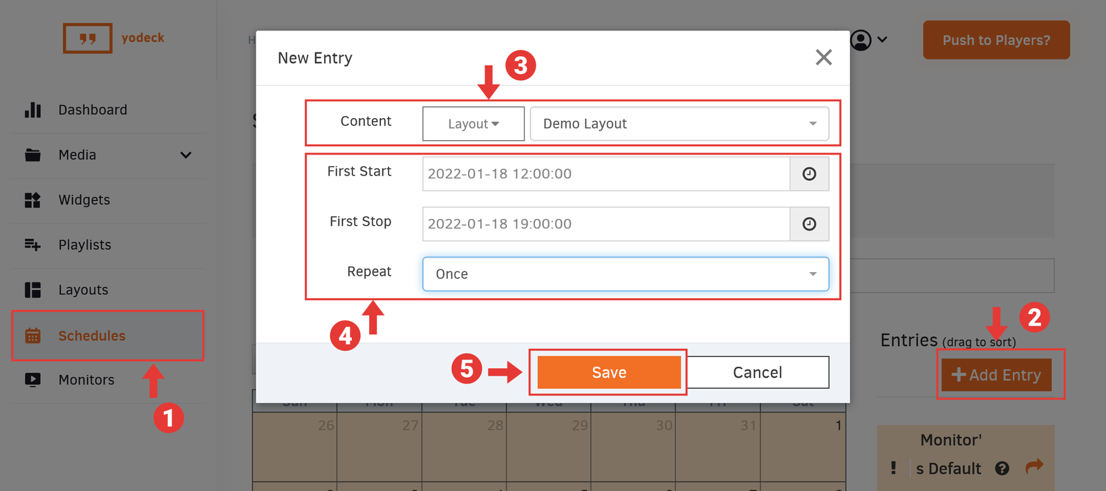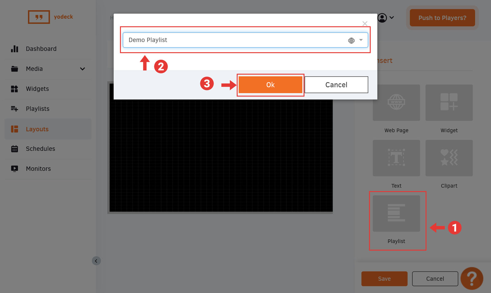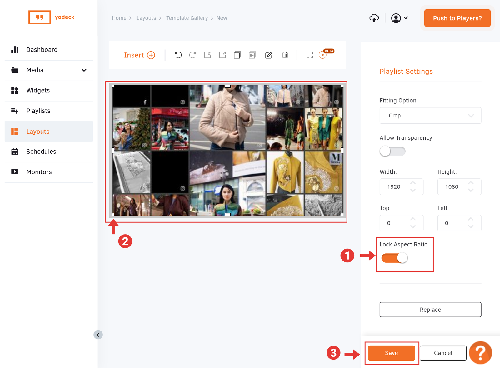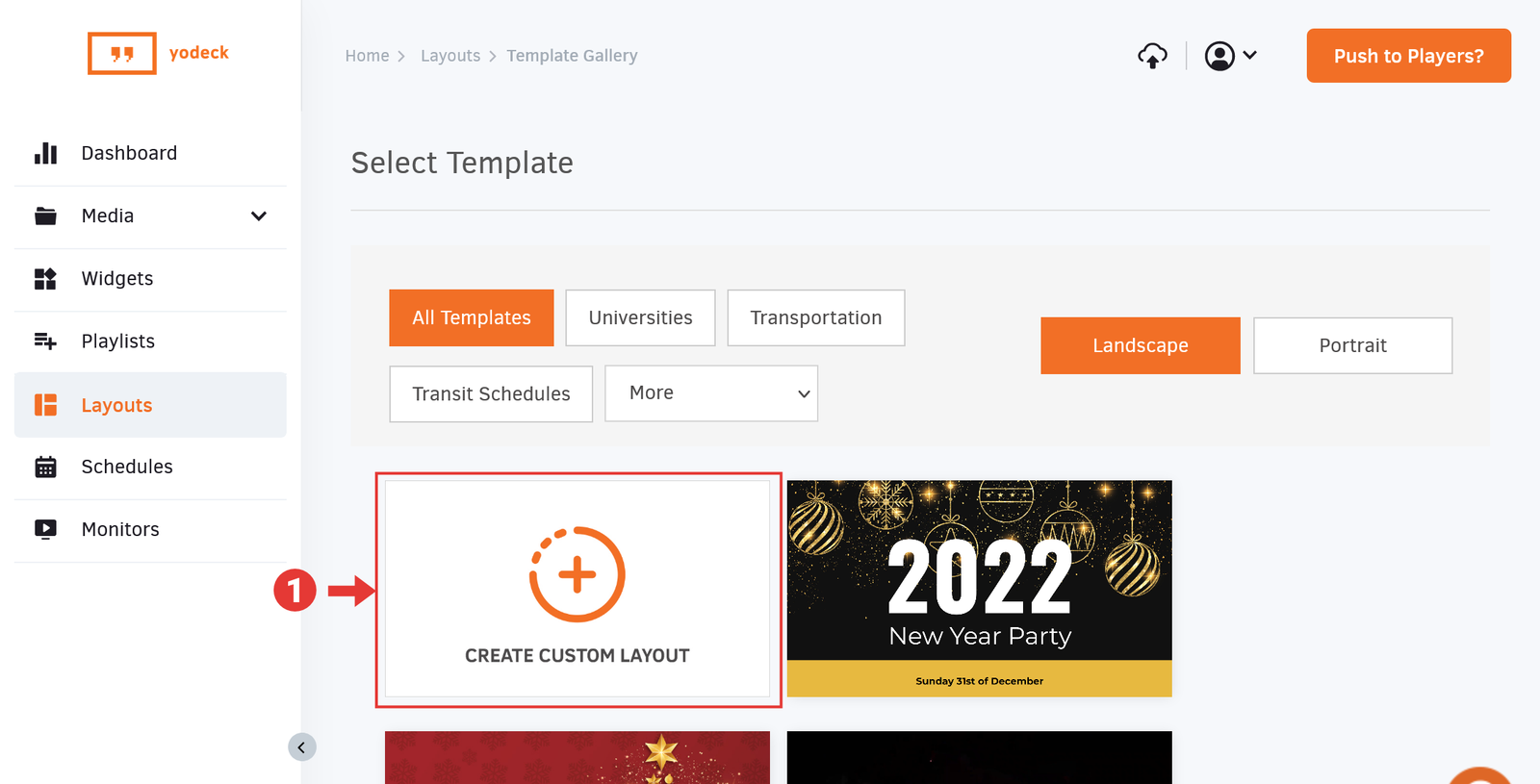 Once you Save the new Yodeck Player, click on the Push to Players? button in the top right to publish your Event Wall on your Yodeck Player.