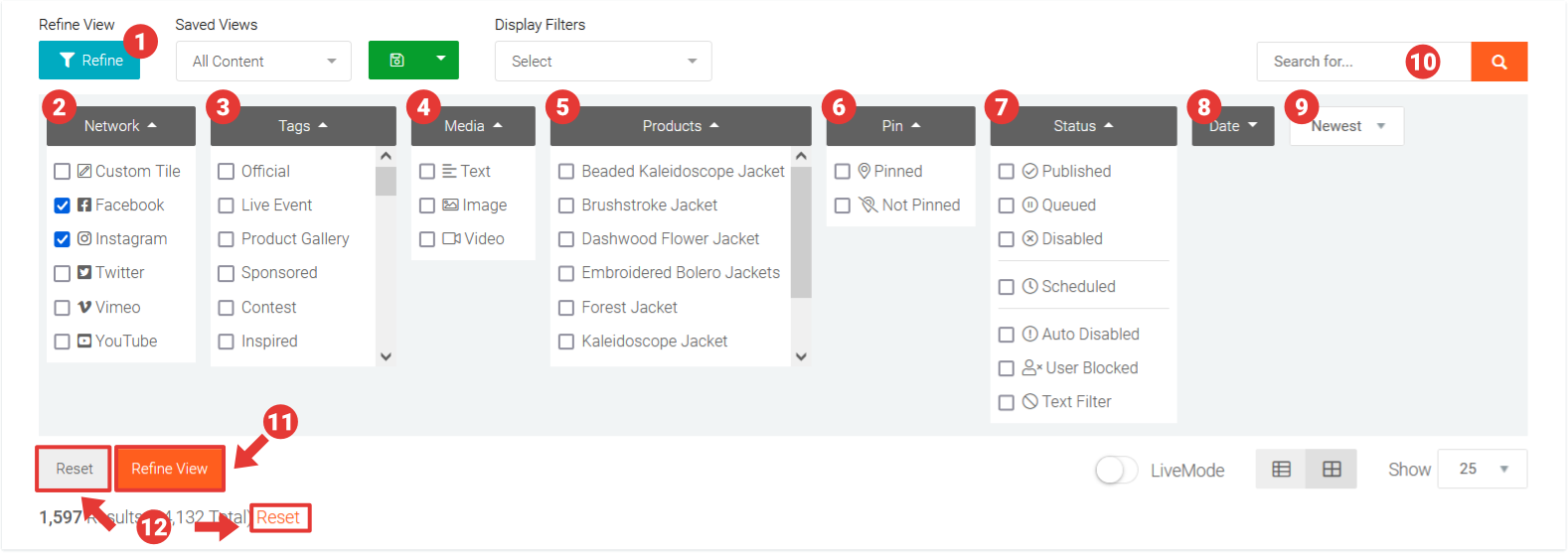 By default, the Moderation View displays all aggregated Content with the most recent items shown first. The Moderation Toolbar provides several ways in which you can narrow down and view a specific segment of content.