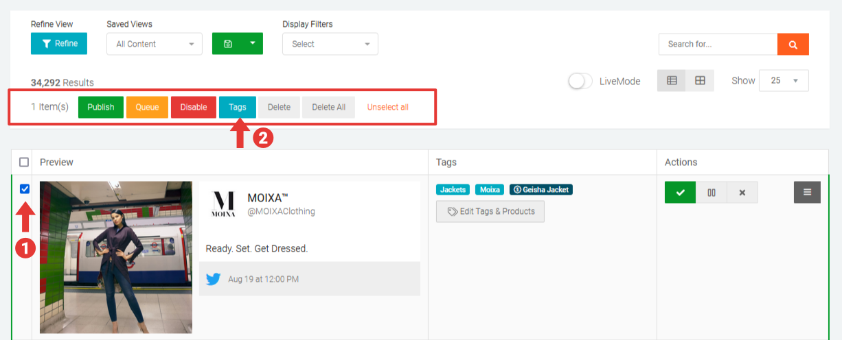 Tagging content in Moderation view