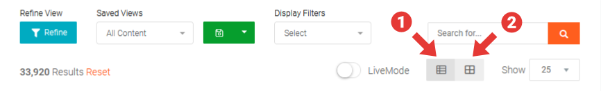 Content (or Tiles) within Moderation View can be displayed in either Tile View or Grid View.