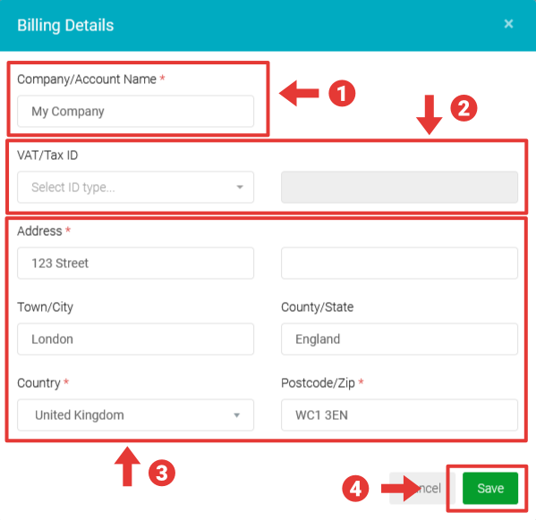 Your billing details appear on your invoices and are used to calculate any applicable VAT/Tax. You can update your billing details at any time by logging into your account. Note that any changes to billing details will only apply to future invoicing – existing invoices remain unchanged.