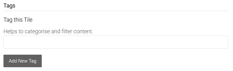 Click in the Tag this Tile field and start typing the name of an existing Tag you want to add to this Tile. You can also click on the Add New Tag button to create and add a new Tag. Tags help you group content to simplify moderation and to filter content to show on different Displays. Learn more about Tags.