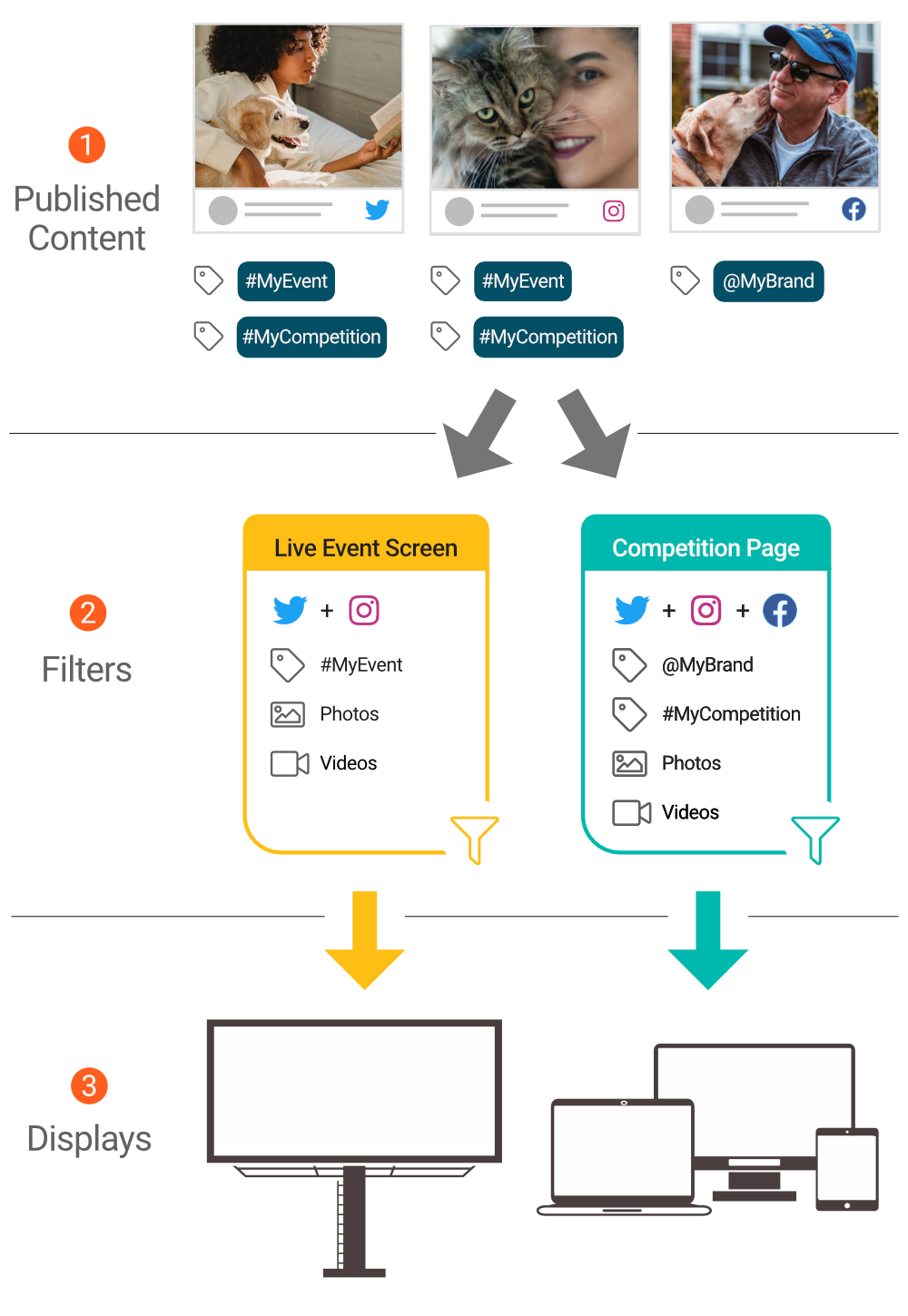 Published Content Your pool of approved content may consist of posts from different social networks, including your official branded content and UGC content, relating to different hashtag campaigns such as competitions and events, containing images or videos, etc.