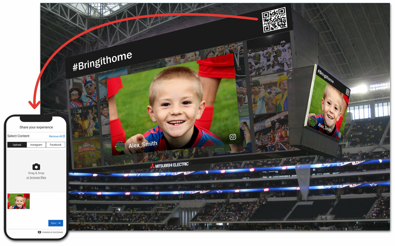 Audiences can also be seamlessly directed to a Form to share content via QR code for example, at conferences, events, in-store digital signage or via digital-out-of-home advertising. The example below shows the use of QR codes on Event Displays to engage audiences at a sports event.